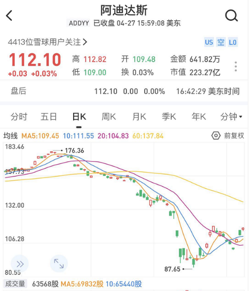 截至目前,阿迪的最新收盘价为112.1美元/股,较今年1月5日,176.36美元/股的最高点,市值已缩水三分之一,仅剩223.27亿美元。