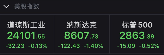 截至收盘,道指跌0.13%报24101.55点,标普500跌0.52%报2863.39点,纳指跌1.4%报8607.73点。