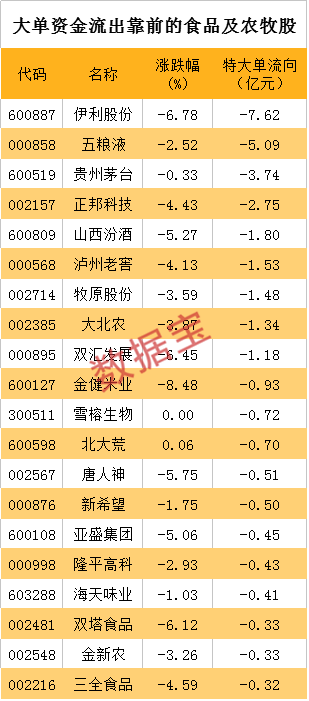 大单资金流出超亿元有24股,其中食品饮料占6股。伊利股份、五粮液两市食品股流出居首,分别流出7.62亿元和5.09亿元。