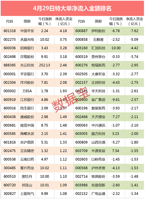 千亿市值的科技龙头汇顶科技跌停,公司昨日披露一季报,净利腰斩,下滑50%,大单资金流出4.4亿元。部分科技龙头股仍被资金卖出,中兴通讯流出超2亿元,晶方科技、兆易创新流出超亿元,紫光国微、卓胜微流出超9000万元。