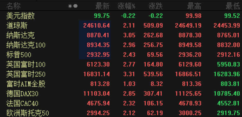欧洲股市方面,英国富时100指数上涨2.77%,德国DAX30指数上涨2.85%,法国CAC40指数上涨2.32%、欧洲斯托克50指数上涨2.12%。