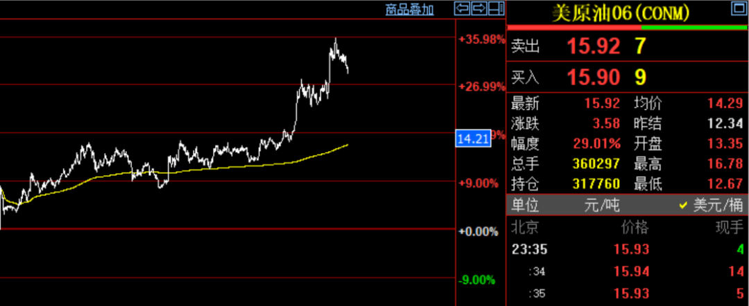 截至发稿,美国6月主力合约暴涨29%,最高一度涨超35%。美油一度触及日高16.61美元/桶,布油7月合约涨超10%,收复25美元关口。