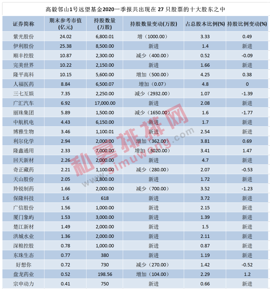 一季报的相继披露也让冯柳的持仓浮出水面,由冯柳担任基金经理的“高毅邻山1号远望基金 ” 2020一季报 共出现在 25 只股票的十大股东之中,期末参考市值合计为 125.55 亿元,仅此规模就已经秒杀国内多数私募。持有市值超10亿元的个股包括紫光股份、伊利股份、顺丰控股、完美世界、隆平高科,其中紫光股份与伊利股份持股市值均超20亿元,前者为增持,后者为新进。
