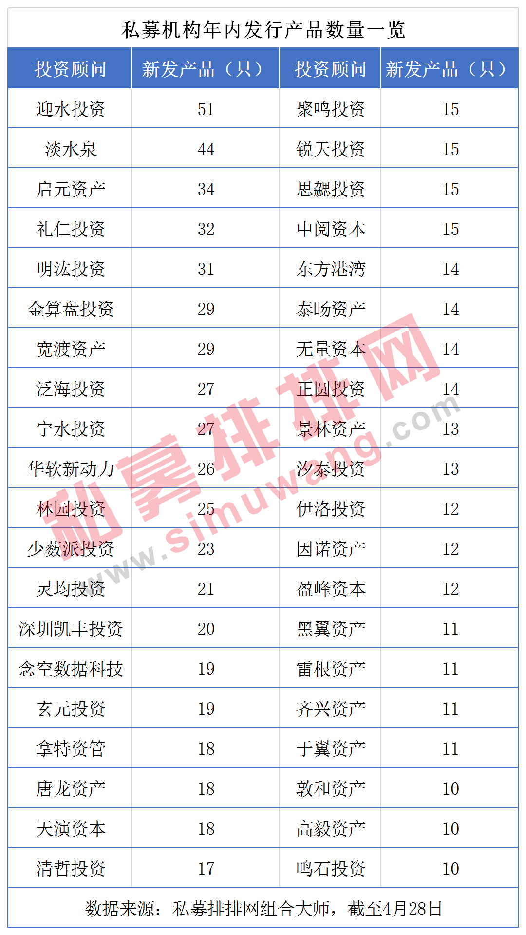 行情震荡,既考验私募的投资管理能力,也考验投资者对管理人的信任与追随。根据私募排排网的统计,截至4月28日,证券类私募今年共计发行4411只产品,较去年的3801只同比增长16.05%。其中迎水投资今年以来发行产品数量超过50只,斩获最勤奋发行产品私募称号;淡水泉投资年内备案产品数量同样超过40只,居于百亿私募之首。