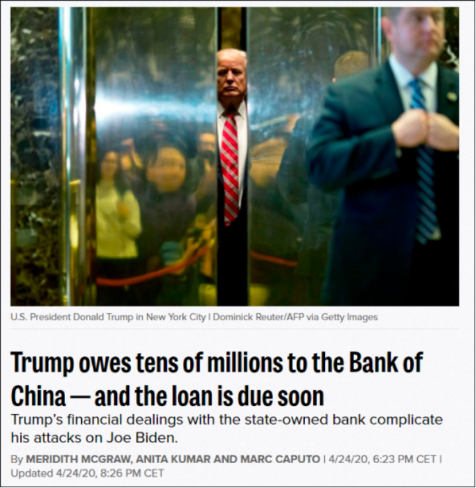 4月24日,“政客”新闻网在24日题为《特朗普欠中国银行数千万美元》的报道中称,特朗普拥有一座持股比30%的房产,被发现欠下中国银行高达2.11亿美元债务。