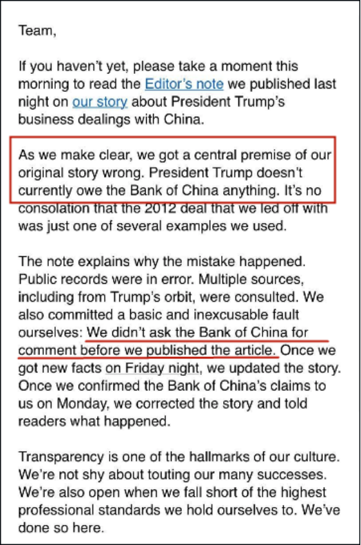 这名编辑解释称,问题源头在于他们引用了错误的公开记录,并且在发稿前没有向中国银行一方求证。他还提到,他们曾试图向白宫和特朗普集团联系,但双方均拒绝置评。