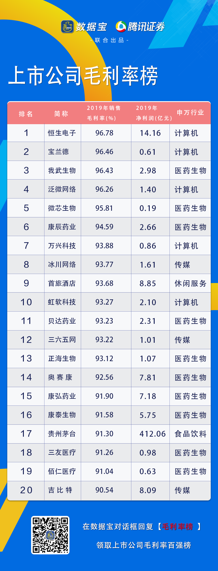 数据宝发布的2019年A股“上市公司毛利率百强榜”显示,销售毛利率排名前三甲的依次是恒生电子、宝兰德、我武生物。恒生电子去年销售毛利率96.78%,排名第一位。恒生电子去年实现盈利14.16亿元,盈利金额创历史新高,公司销售毛利率已连续六年保持90%以上。近几年公司正在迅速追赶、不断拉近与国际领先的金融科技巨头公司的差距,在IDC Fintech Rankings 100排名中,公司排名整体呈上升趋势,2019 年排名为43位。