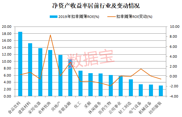分行业来看,去年ROE排名前三甲的行业是食品饮料、建筑材料、家用电器。食品饮料行业ROE为18.52%,再次蝉联行业榜首, 且达到七年来最高水平。与2018年相比,农林牧渔、非银金融、传媒、电气设备、轻工制造等行业ROE提升较为明显。农林牧渔行业ROE提升最大,行业去年ROE达到13.28%,较上一年提升8.34个百分点。