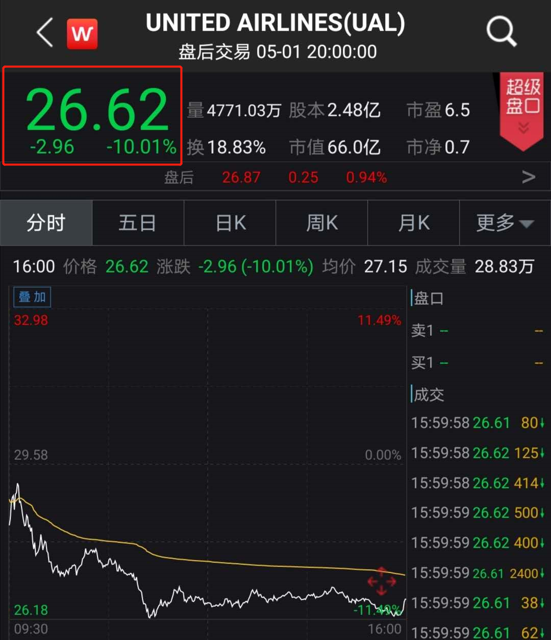 受此消息影响,美联航下跌10%,报收26.62美元/股。