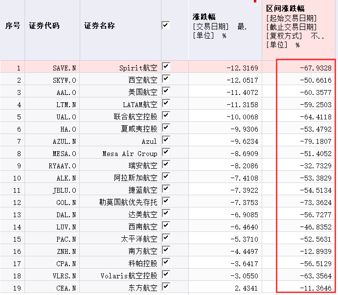 北京时间5月1日晚间,美国最大的廉价航空公司Spirit航空暴跌超12%,巴菲特曾经钟爱的美联航和美国航空下跌超10%,达美航空和西南航空业下跌超6%。