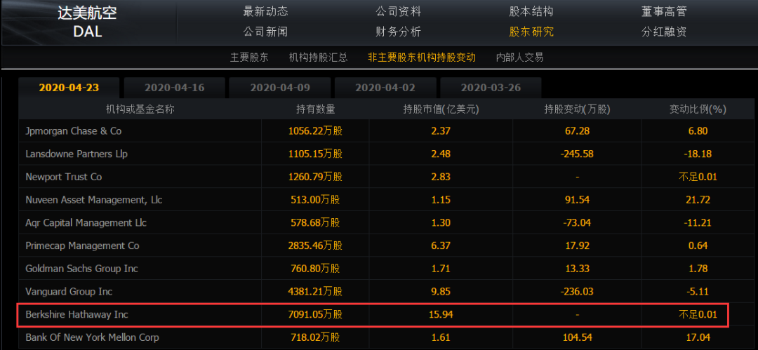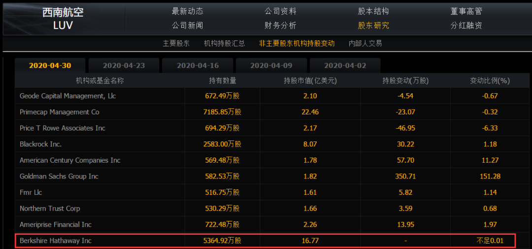 4月底,巴菲特持有达美航空和西南航空也已经公布了各自惨淡的2020年一季报。财报显示,截止目前,巴菲特仍持有达美航空7091万股,西南航空5364万股,均不足0.01%。