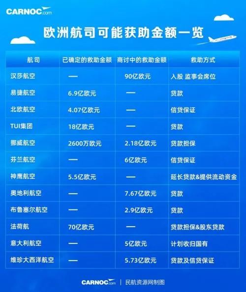 欧洲方面,大型航司获得了政府的帮助。例如,意大利政府将考虑在总额280亿美元的财政刺激计划中为意大利航空提供6亿美元贷款,并考虑国有化意大利航空;瑞典和丹麦宣布了对航空公司SAS的3亿美元贷款担保等。