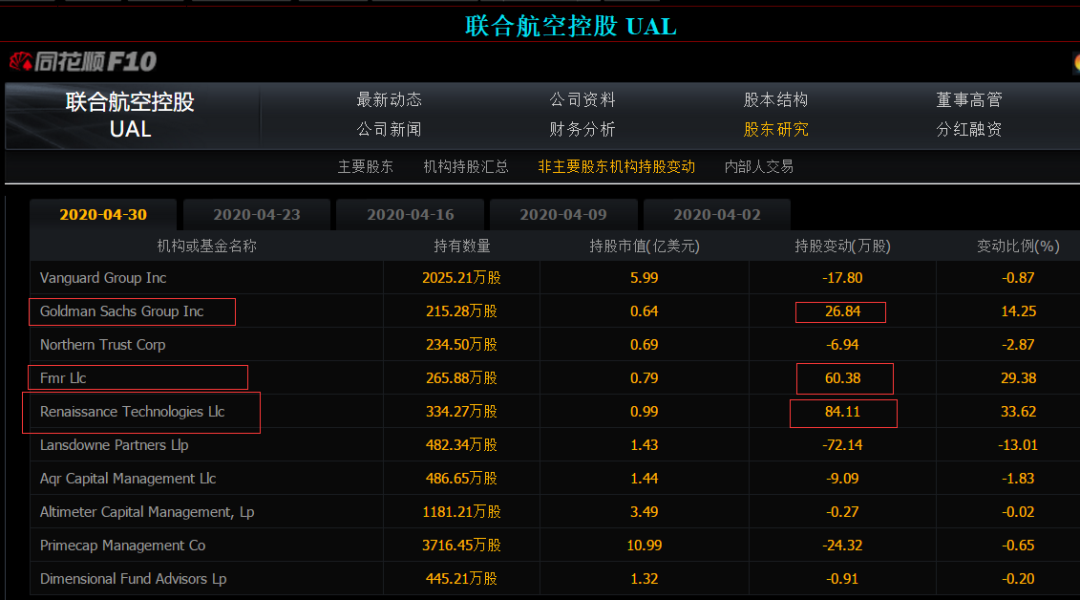 以美联航为例,在巴菲特大举清仓美联航股票的同时,高盛、西蒙斯的文艺复兴基金以及波士顿富达投资公司都不约而同地悄悄增持了美联航。