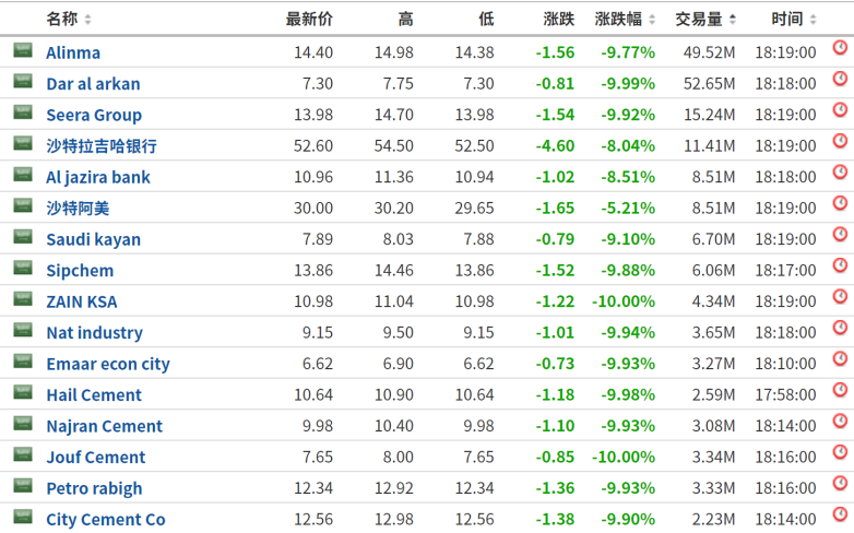 盘面上看,沙特市场多只权重股跌幅均超9%以上,甚至出现跌停的情况。