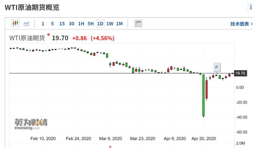 4月28日,WTI原油期货6月合约盘中跌幅再度达到20%。不过随后三天,WTI原油6月合约价格又重新回到20美元附近。