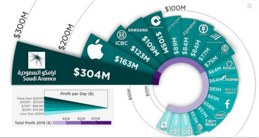 除了市场表现之外,沙特阿美的赚钱能力更是惊人。根据最新出具的2019年年报,沙特阿美公司2019年净利润为882亿美元,每天获利3.04亿美元,每秒要赚3519美元。这一赚钱能力远超美国苹果和中国工行,沙特阿美依然是全球最能赚钱的公司。