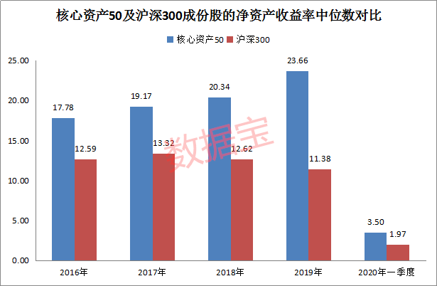 相比之下,沪深300成份股自2016年至2019年其ROE中位数从未超过15%,2020年一季度仅有1.97%,全部A股同期仅有0.8%,均低于核心资产50成份股同期水平。