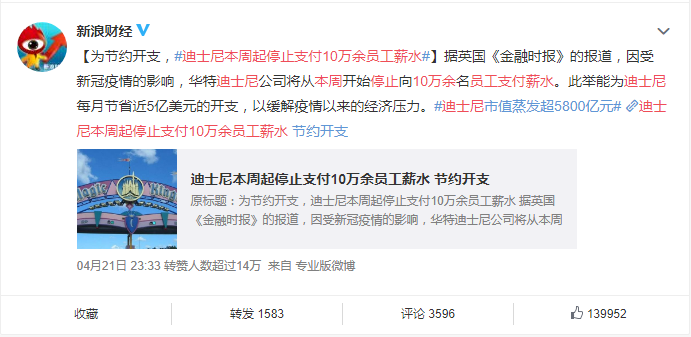 4月21日,迪士尼宣布停止向10万员工支付薪水,占到了全球员工的一半以上。
