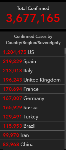 据美国约翰斯·霍普金斯大学疫情实时监测系统统计,截至5月6日下午4时32分,美国已有新冠病毒感染病例120.4万例,仍在保持日增超2万的速度,其中死亡病例突破7万例。至此,全球确诊367.7万例。