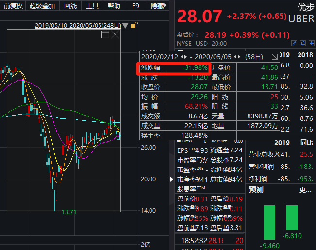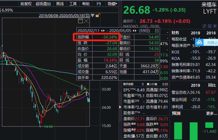 而去年上市的uber,自疫情爆发以来,股价一度腰斩。如今即使反弹,仍跌幅超30%。市值为484亿美元,蒸发超227亿美元(约合人民币1610亿元)。