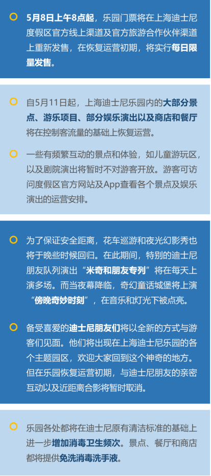 上海迪士尼度假区表示,开园后将限流、要求游客提前购票及预约入园,在排队区和餐厅等人流密集处设置安全距离,并增加卫生消毒的频次。