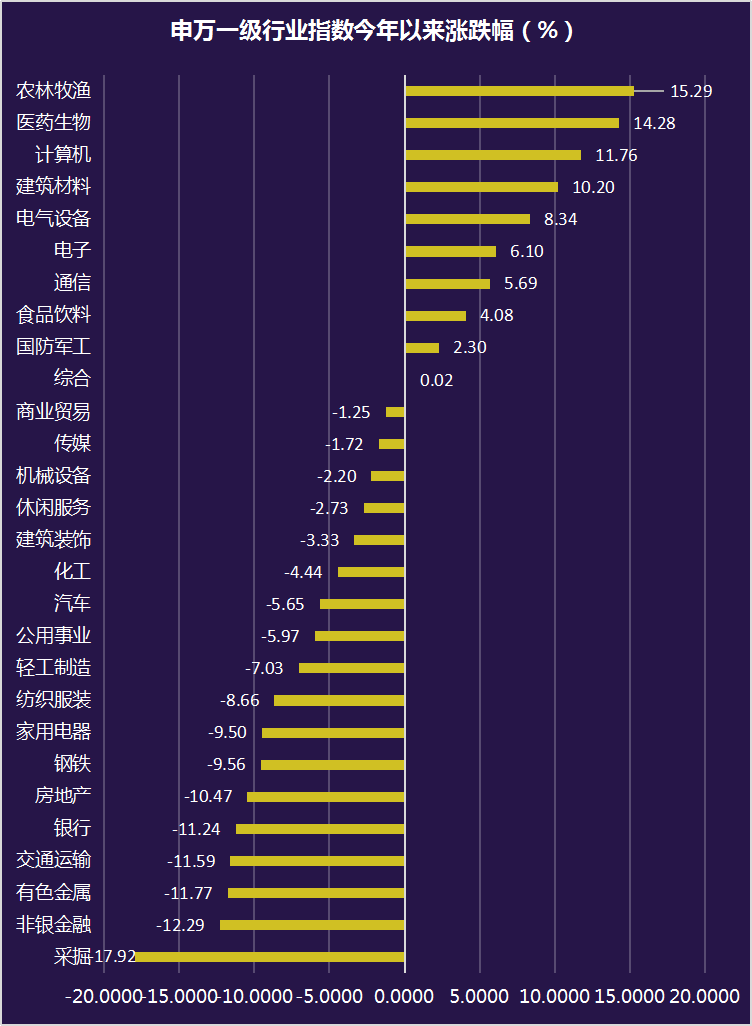 虽然医药与科技被寄予厚望,但是农林渔牧板块却成为年内的“王者”。截至4月30日,28个申万一级行业指数中仅有4个行业指数超过10%,其中农林渔牧就以15.29%的涨幅居于首位,还领先于医药生物和计算机。