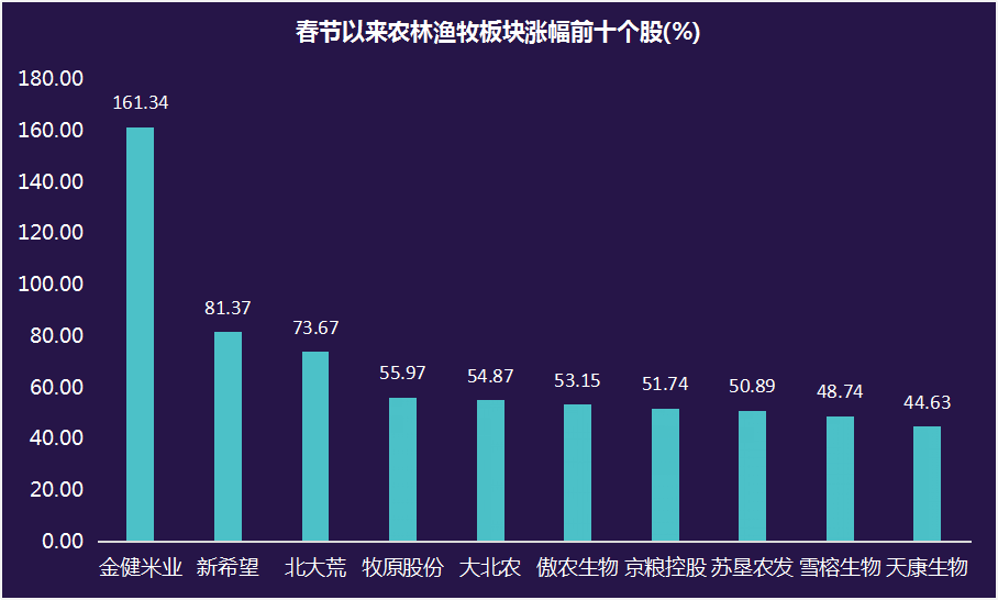 龙头股新希望和北大荒在节后的涨幅也分别达到81.37%、73.67% 新希望的一季报也是十分亮眼,一季度实现营业收入205.68亿元,同比增26.87%;归属于上市公司股东净利润为16.27亿元,同比增幅144.13%。对于一季度净利润大幅增长的原因,新希望表示主要因为猪产业生猪出栏数量稳步提升,且受行情影响,生猪销售价格持续上涨,公司养猪产业利润同比大幅上涨;二是公司饲料产业不断加强产品研发、市场开发与服务,持续提升饲料产业的产品力、采购力、制造力、服务力,实现销量与利润均较同期有较大幅度增长。同期涨幅较大的北大荒则是我国目前规模大、现代化水平高的种植业上市公司和重要的商品粮生产基地。