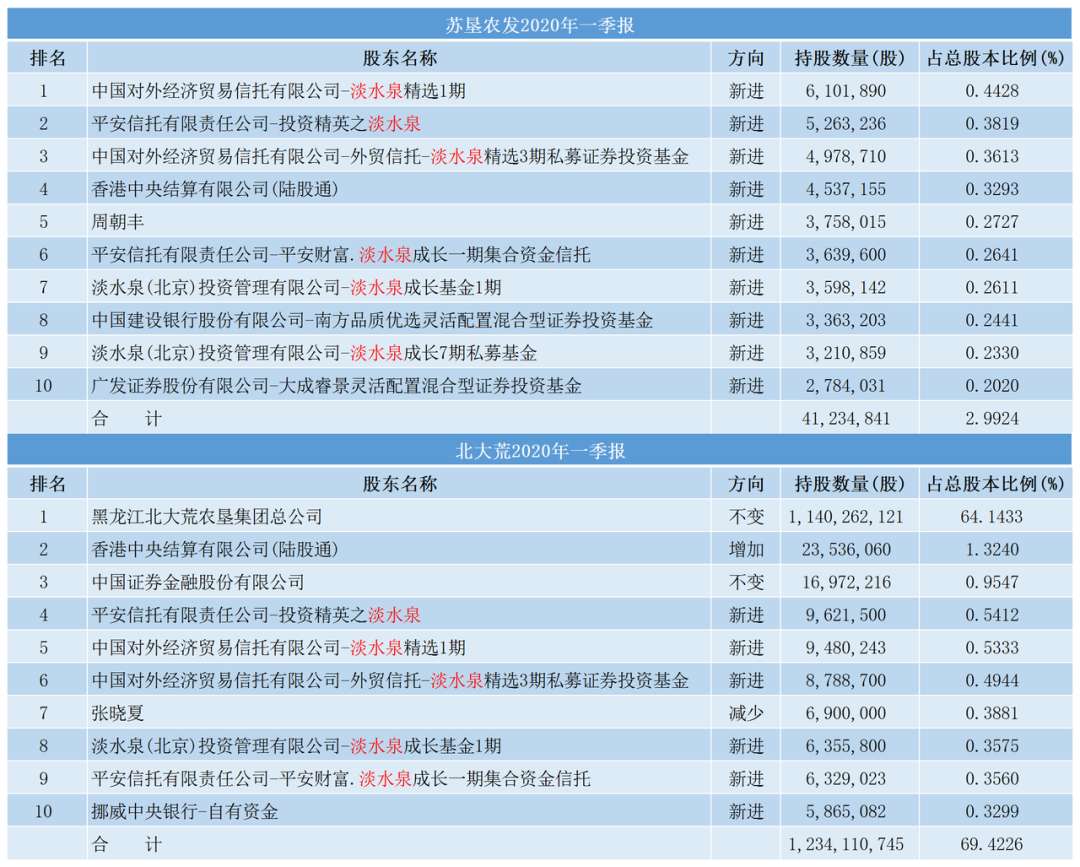 一季报的披露也让机构的持仓股浮出水面,种植业就获得外资、社保、私募等多路资金的集体追捧。截至一季度末,种植龙头北大荒的前十大流通股东中就惊现百亿私募淡水泉的五只产品,分别是“平安信托有限责任公司-投资精英之淡水泉”、“中国对外经济贸易信托有限公司-淡水泉精选1期”、“中国对外经济贸易信托有限公司-外贸信托-淡水泉精选3期私募证券投资基金”、“淡水泉(北京)投资管理有限公司-淡水泉成长基金1期”、“平安信托有限责任公司-平安财富.淡水泉成长一期集合资金信托”,分列第4、5、6、8、9大股东。合计持股数量为4057.53万股,占公司总股本的2.28%。按照期末股价计算,淡水泉5只产品的持仓北大荒的市值约为7亿元。