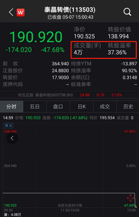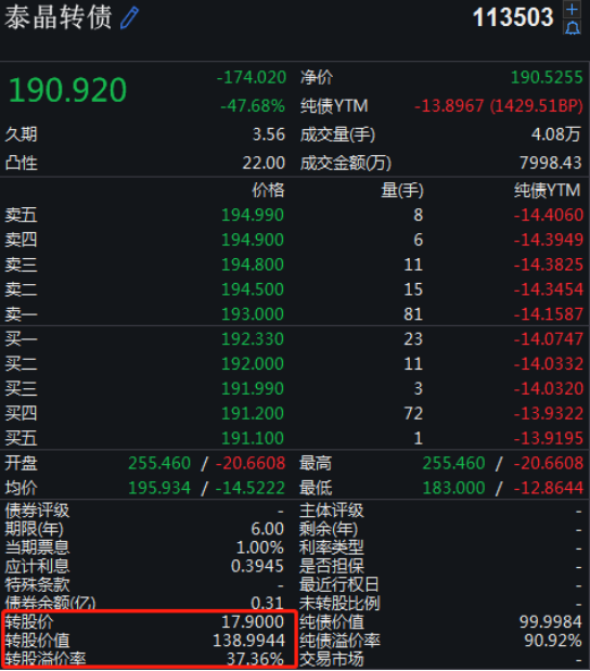 截至当日收盘,泰晶转债报收190.92元,跌超47.68%。成交额近8000万。