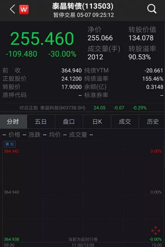 赎回公告发布后,噩梦果然出现。5月7日开盘,泰晶转债迅速暴跌30%,砸盘资金疯狂出逃,随后触发临停至当天14:57后再恢复交易。