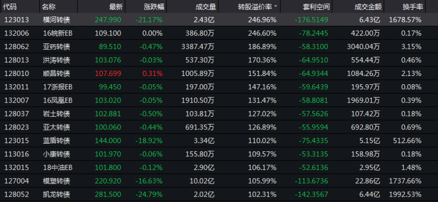 不过目前,市场上转股溢价率较高的可转债品种仍需要投资者高度注意,部分已经触发了强制赎回的条款,后续行情也会出现剧烈调整,投资者需要谨慎买入。