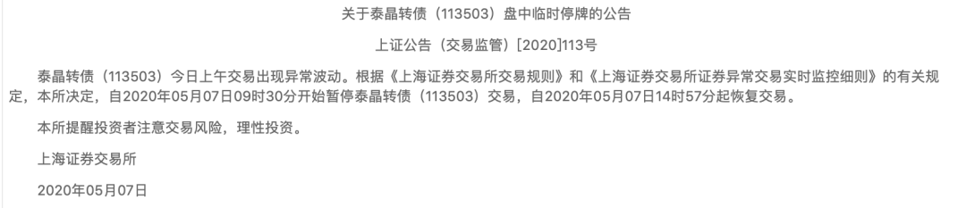 5月7日泰晶转债集合竞价暴跌30%,触发临停机制,报255.46元。上交所公告称,暂停泰晶转债交易,当天14时57分起恢复交易。集合竞价时仅有一笔成交,即2012手逃出生天,成交额514万元。