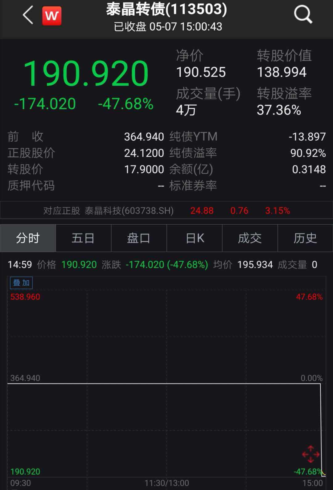 收盘前的最后三分钟,没有涨跌停限制,也没有临时停牌,投资者疯狂逃出,跌幅扩大。泰晶转债全天暴跌47.68%,报收190.92元,成交额7998万元。转股溢价率从6日的170.83%迅速下降到37.36%。数据显示,泰晶转债目前的转股价值为138.994元,而收盘价为190.92元,也就意味着经过暴跌后,仍有27%的下跌空间。