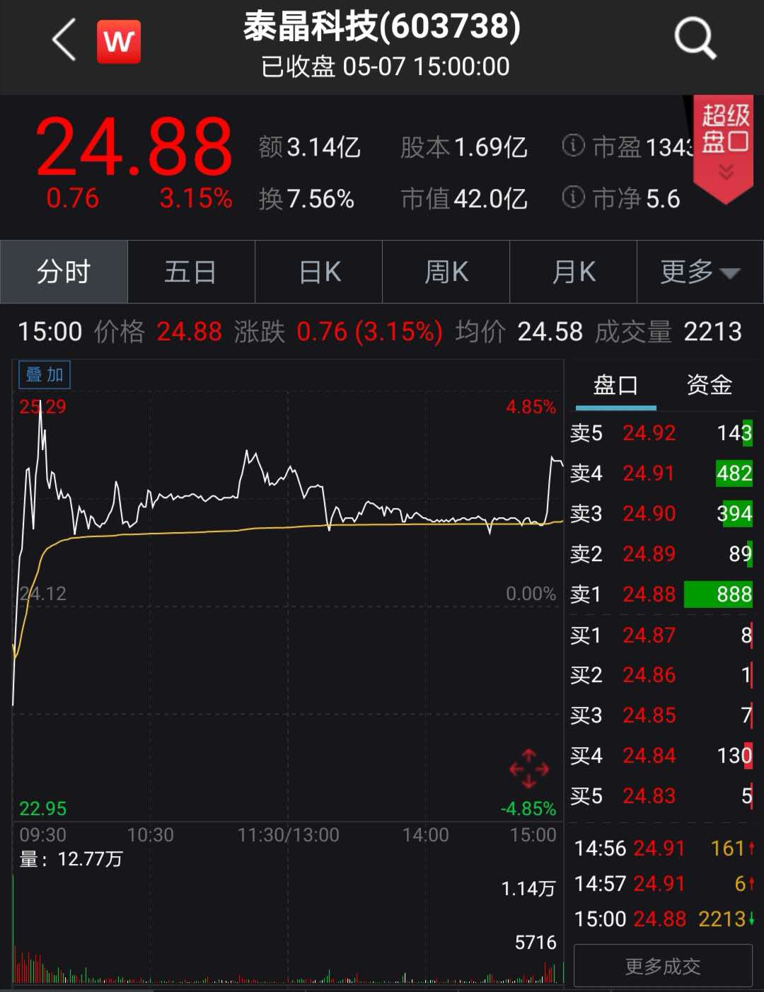 正股方面,泰晶科技今日继续上涨,开盘15分钟内股价被爆拉,一度涨4.64%。收盘涨3.15,报收24.88元。