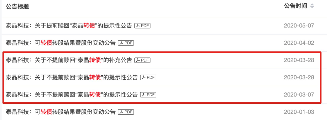 5月6日泰晶科技发布提前赎回提示性公告,称在3月30日至5月6日期间,连续30个交易日中至少有15个交易日收盘价格不低于“泰晶转债”当期转股价格的130%(即23.27元/股),已触发“泰晶转债”的赎回条款。转债持有人面临三种选择: