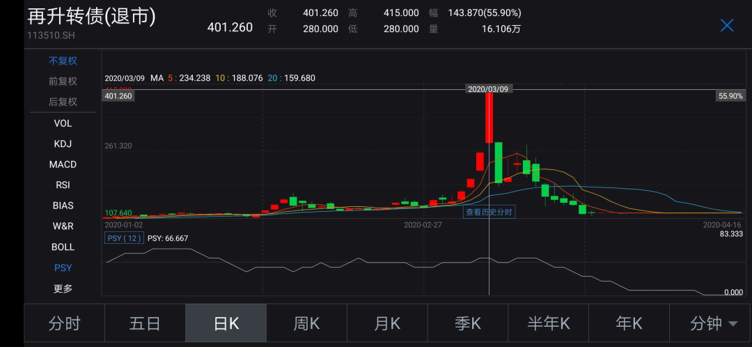 事实上,转债市场此前已经出现过赎回“惨案”。彼时再升科技因口罩概念疯狂上涨,带动再升转债在3月9日涨到415元的天价,正当投资者处在上涨喜悦时,当天公司发出强制赎回公告后,令持有人倍感震惊。转债走势随后出现八连阴,较高位跌去七成。