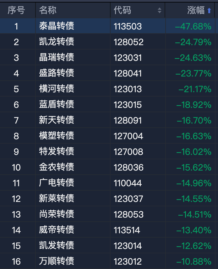 今日,除了泰晶转债以外,多只转债也出现大跌。凯龙转债、晶瑞转债、盛路转债均跌20%以上。