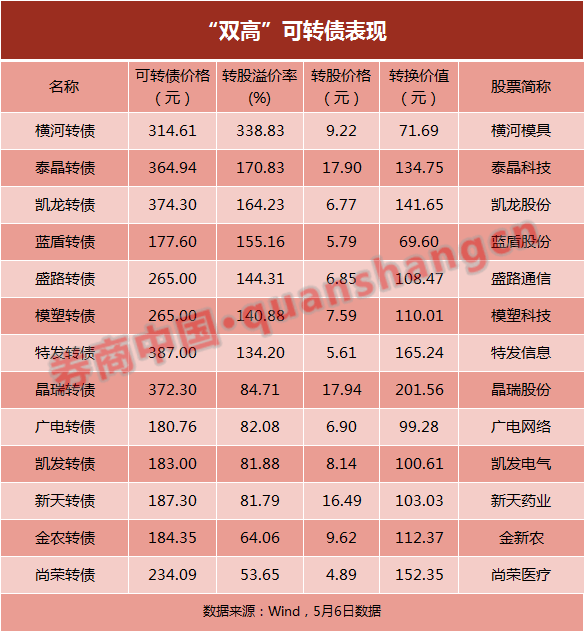 那么就要警惕“双高”(高债价、高转股溢价率)标的。根据Wind统计,截至5月6日,转债价格高于150元且转股溢价率高于50%的有以下标的: