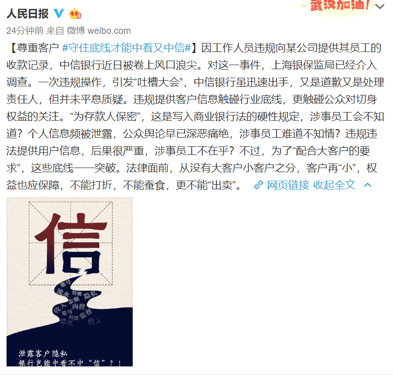 “在客户信息保护方面,我行建立了一整套制度及流程,但个别员工未严格按照制度操作,反映出我行个别机构在制度执行上不到位。”中信银行针对此事作出处理:我行已按制度规定对相关员工予以处分,并对支行行长予以撤职。