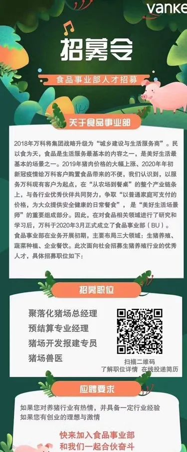 招聘广告显示,万科于2020年3月正式成立食品事业部。食品事业部在业务开展初期将布局生猪养殖,目前猪场招聘岗位包括聚落化猪场总经理、驻场开发报建专员、兽医等。