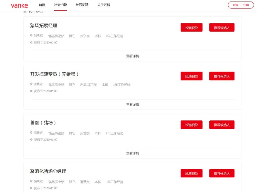 “招募令”显示,万科招聘包括猪场拓展经理、聚落化猪场总经理、养猪场预结算专业经理、猪场开发报建专员、猪场兽医在内的5个社招岗位,工作地点均在深圳。