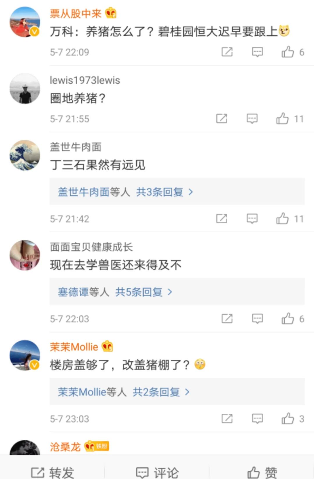 有网友表示能够理解,“毕竟今年二师兄身价暴涨”“以后万科是畜牧业股了”,也有人表示,“做梦都想不到”、“也许万科能建比较好的猪舍”。