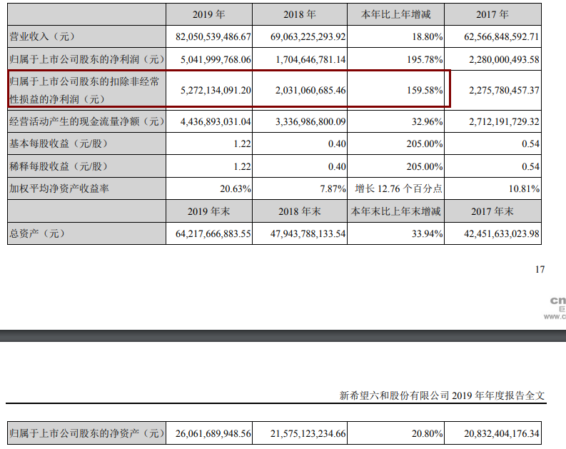 财报显示,新希望2019年营收820.51亿元,同比增长18.8%;净利润50.42亿元,同比增长195.78%;每股收益1.22元。