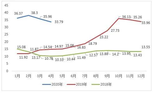 近三年全国猪肉平均价格趋势图显示,2018年猪肉单价在10元/斤-14元/斤之间波动;到了2019年,上半年全国猪肉价格比较平稳,尚未超过15元/斤。而到了下半年,从7月份开始,猪肉价格就路飙升,最高到了36.13元/斤;2020年一季度,猪肉价格维持了2019年下半年的行情,最高价格到达38.3元/斤。