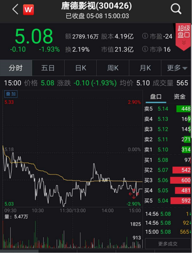截至5月8日收盘,唐德影视报收5.08元,跌近2%。相比刚上市时期,拥有诸多明星光环的唐德影视,五年时间,其市值也从160亿高位蒸发近九成,目前市值仅剩21亿元。