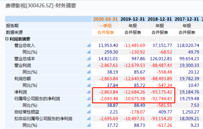 据4月29日发布的年报显示,唐德影视2019年营业收入亏损1.15亿,同比下降130.92%;净利润亏损1.27亿。这已经是唐德影视第二年亏损了。此前的2018年,唐德影视净利润就已亏损了9.52亿。