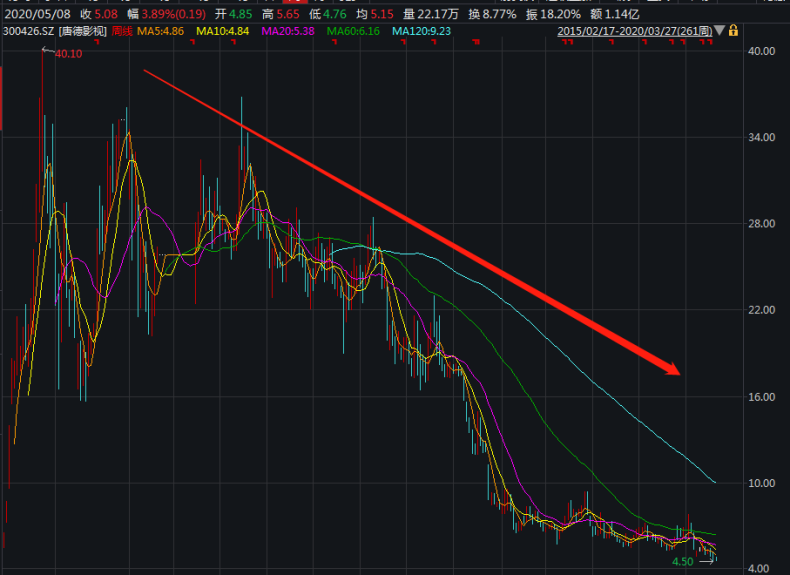 二级市场,唐德影视的股价也是跌跌不休。从2015年至今,短短五年之间,唐德影视的股价已经从40元高位最低跌至2元左右,曾经拥有超160亿市值,如今股价和市值均跌超九成。