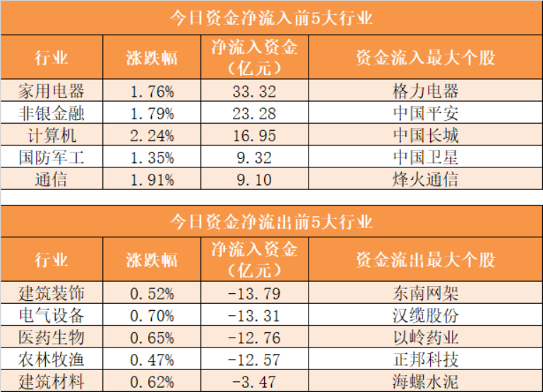 28个申万一级行业中,15个行业实现资金净流入,其中家用电器行业净流入33.32亿元居首。