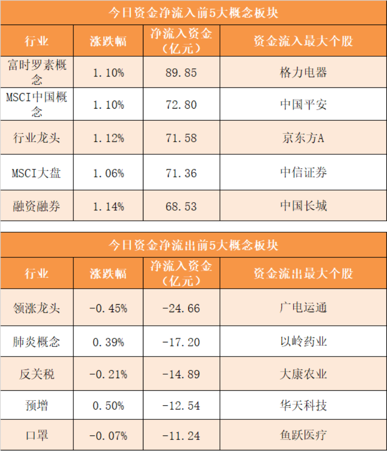 概念板块方面,今日富时罗素概念、MSCI中国概念、行业龙头、MSCI大盘等概念板块资金呈现净流入,其中富时罗素概念净流入89.85亿元居首。