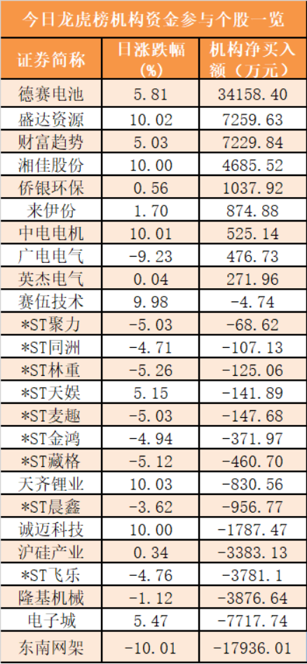 盘后龙虎榜数据显示,机构现身25股,其中德赛电池等9只股票呈现机构资金净买入,东南网架等16股呈现机构资金净卖出。